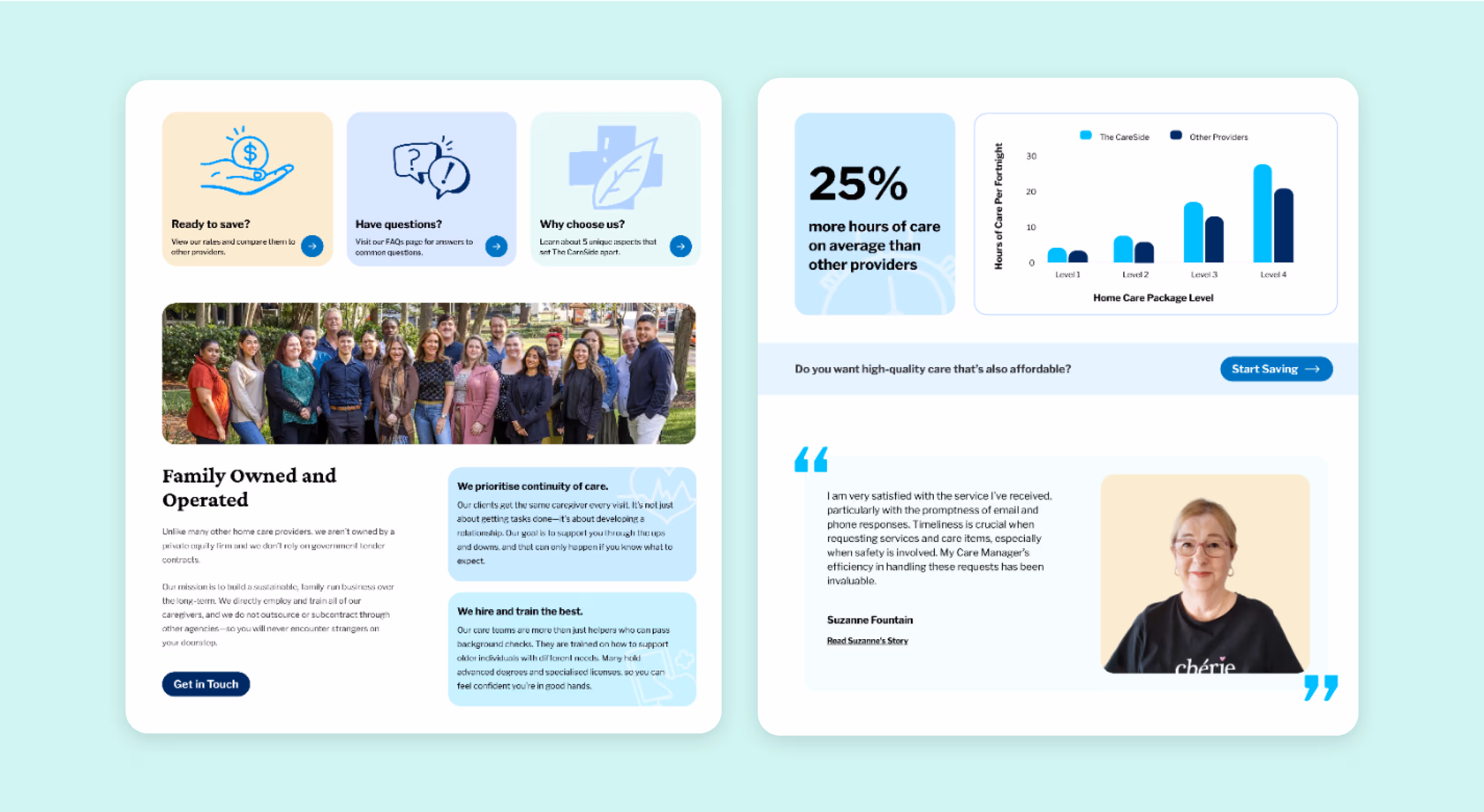 The CareSide delivers Australia's highest quality aged care at the industry’s most affordable prices. Their promise is simple but powerful: They give you more. With that in mind, we partnered with their marketing team to evolve their digital presence in a way that honors their values and speaks directly to the people they serve—elderly clients and their families.